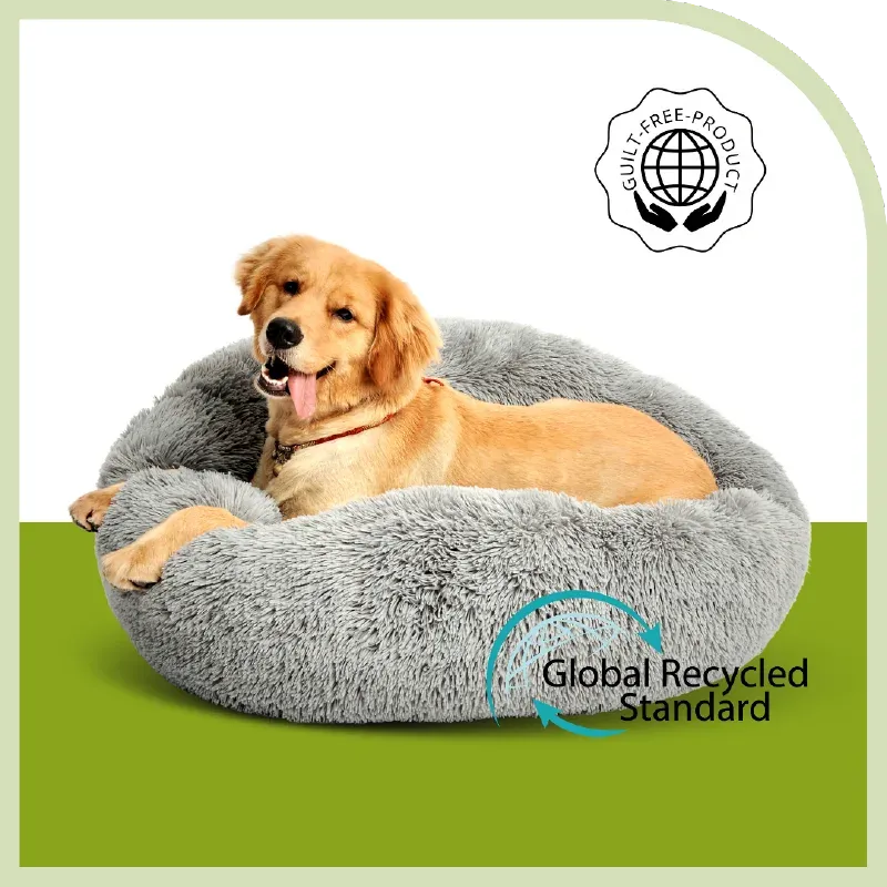 Our Donut dog bed is made of Global Recycled Standard (GRS) fabrics. The outer plush, the PP fiber filling inside the bolster and the bottom cushion, the lining fabric of inner fillings, and the donut bed bottom are all made from Global Recycled Standard (GRS) fabrics.