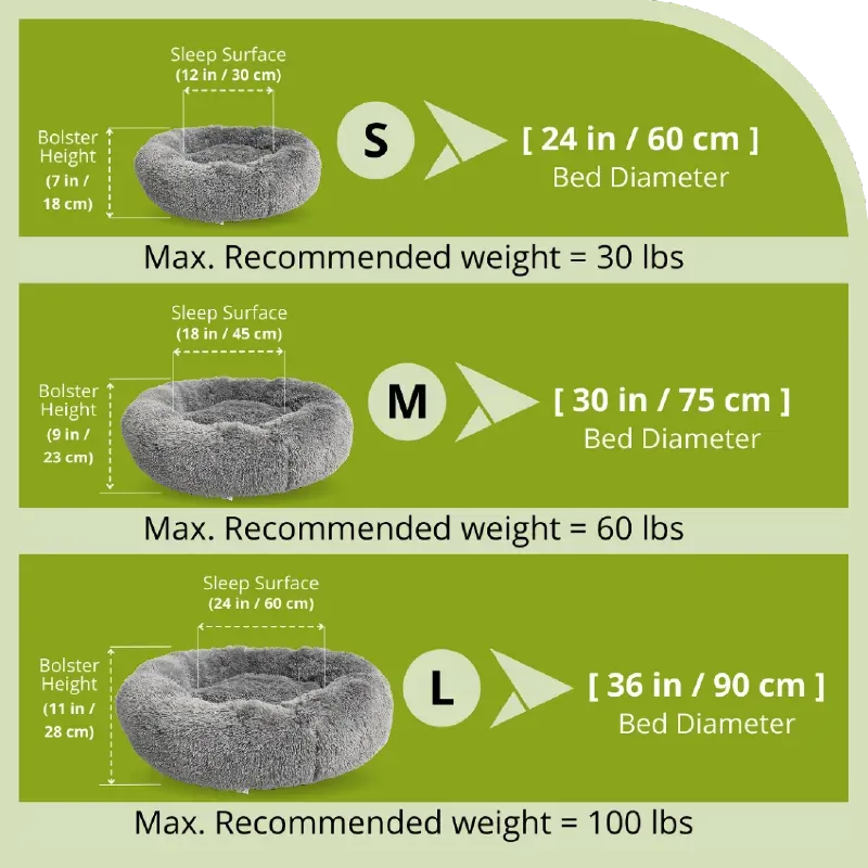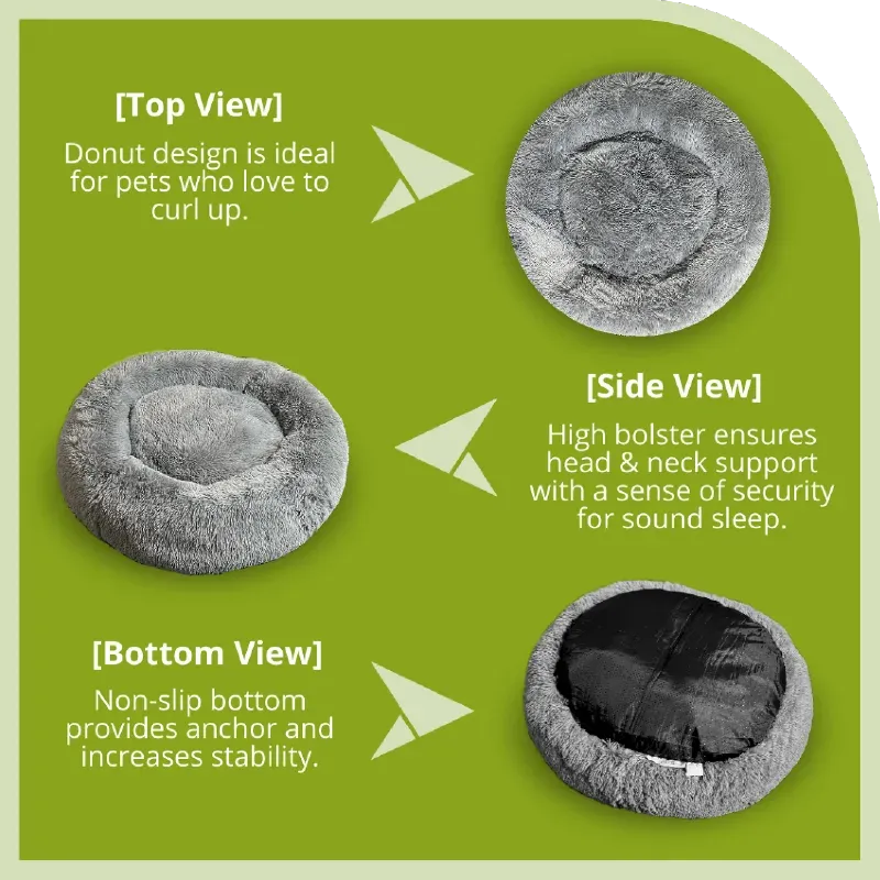 This anti-anxiety dog bed has a circular DONUT design which is desirable for pets who like to curl. It provides a sense of security and sound sleep due to extra joint and muscle support to your pet with a non-sagging bolster and center cushion.